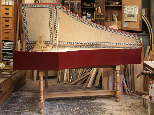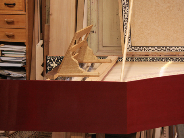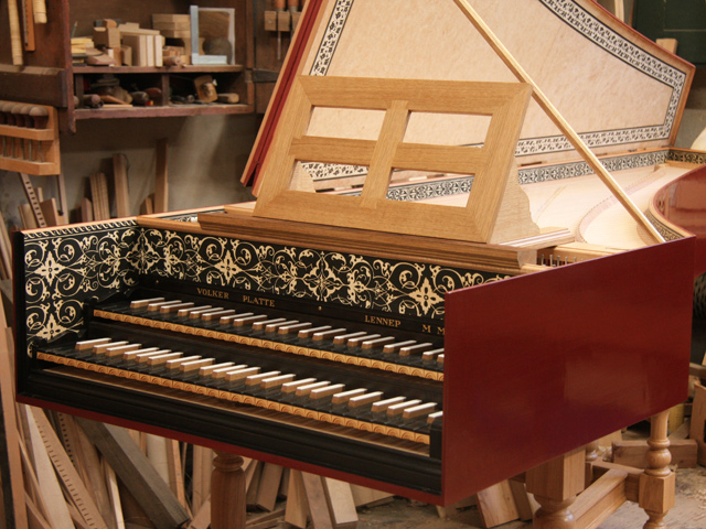 - Zweimanualiges flämisches Cembalo nach Johannes Ruckers (1624), petit ravalement um 1700, 8′, 4′, 8′, Lautenzug, Tonumfang GG, AA–d“‘, Transponierung 440 Hz/415 Hz.