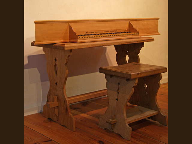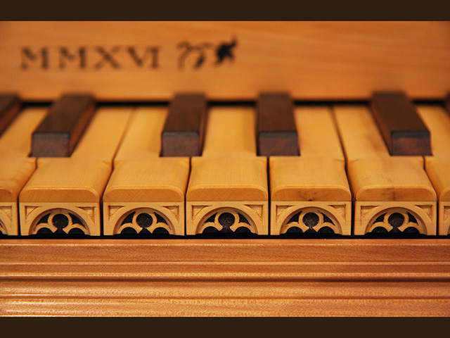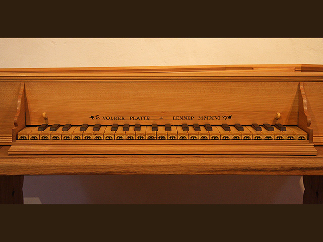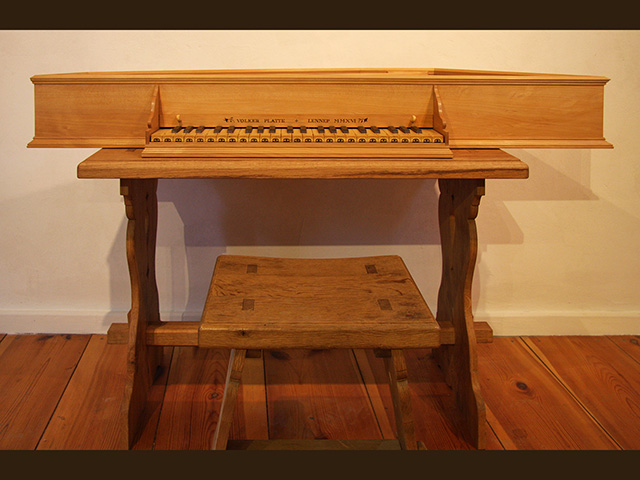 - Polygonales Spinett nach Dominicus Pisaurensis (1540), mit verkleinertem Tonumfang C/E–c“‘ und Eisenmensur, Stimmtonhöhe f’=440 Hz.