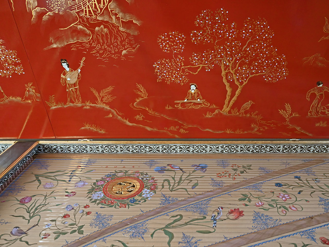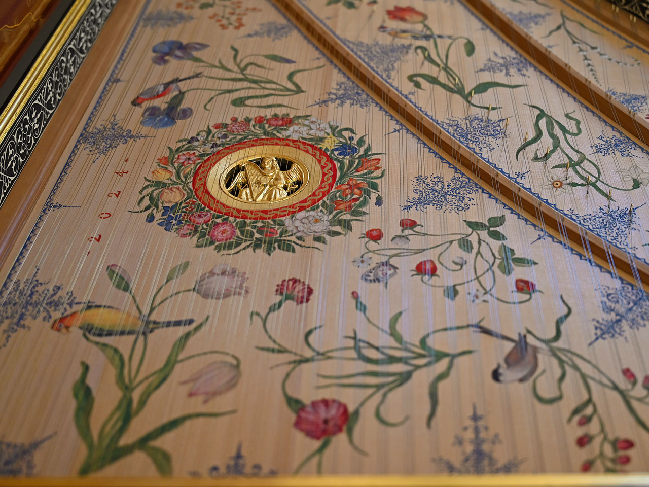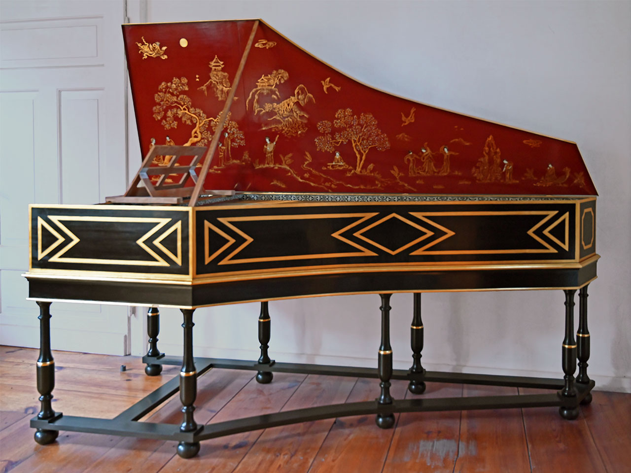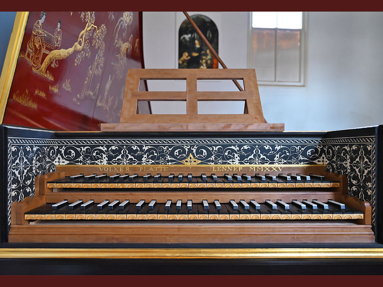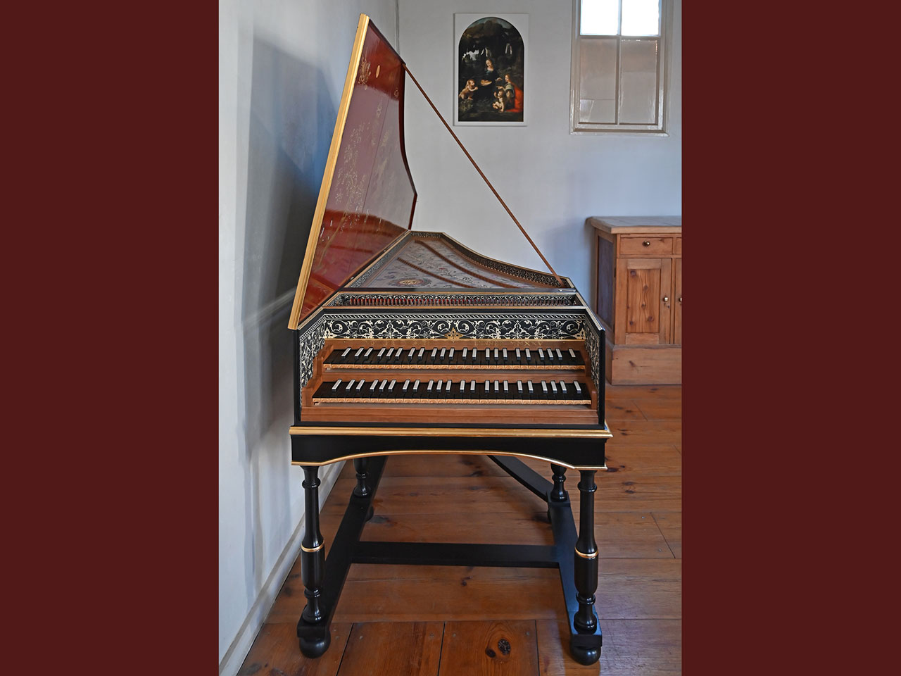 - Zweimanualiges flämisches Cembalo nach Johannes Ruckers (1624), Petit Ravalement, Tonumfang FF, GG, AA -d“‘, 8′, 4′, 8′, Lautenzug, mit Chinoiserien von Jessica Zappe im Deckel und Resonanzbodenmalerei von Eva Thomas.